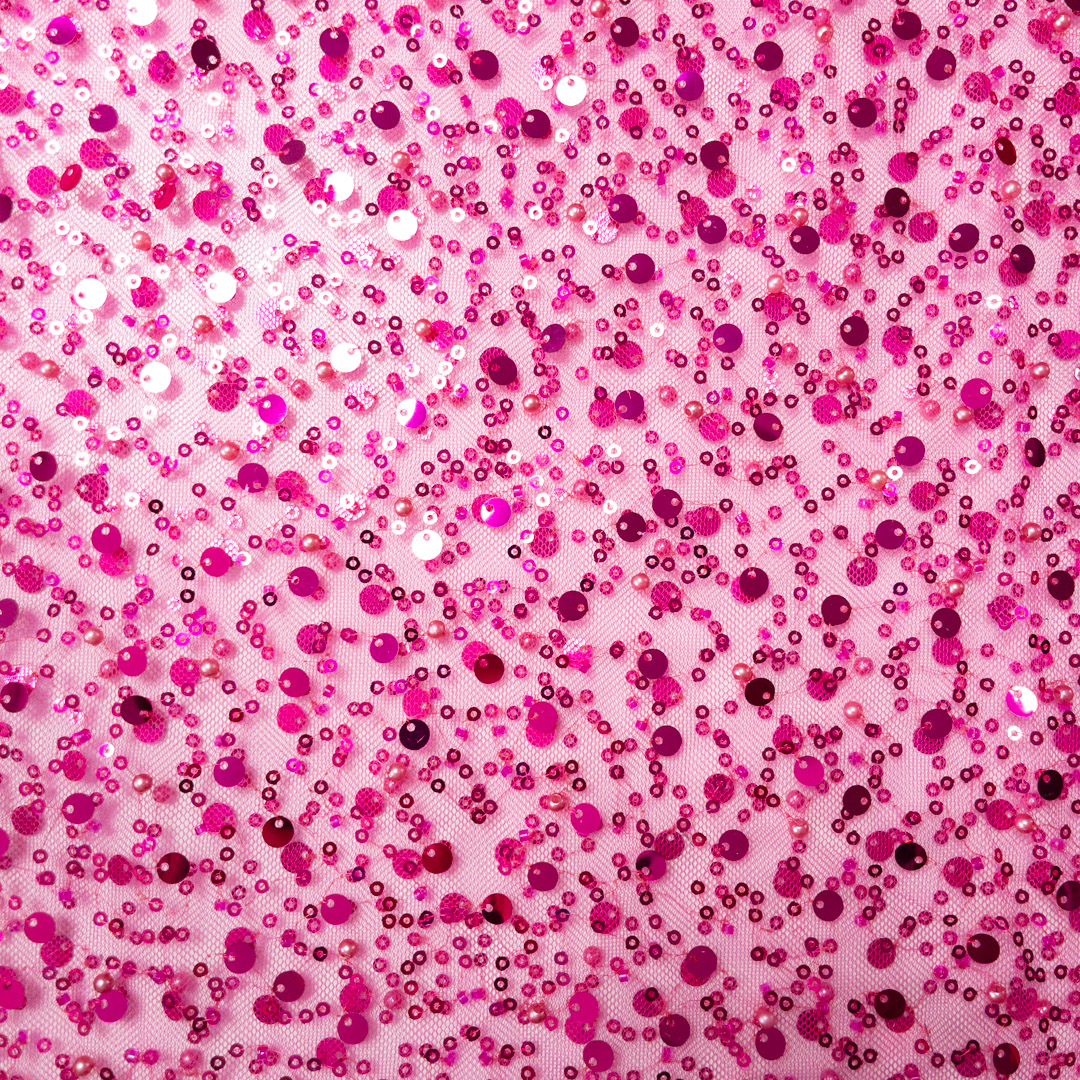 Tul bordado con pedrería de perlas, canutón, mini lentejuelas y mostacillas que le dan mucho brillo al movimiento.