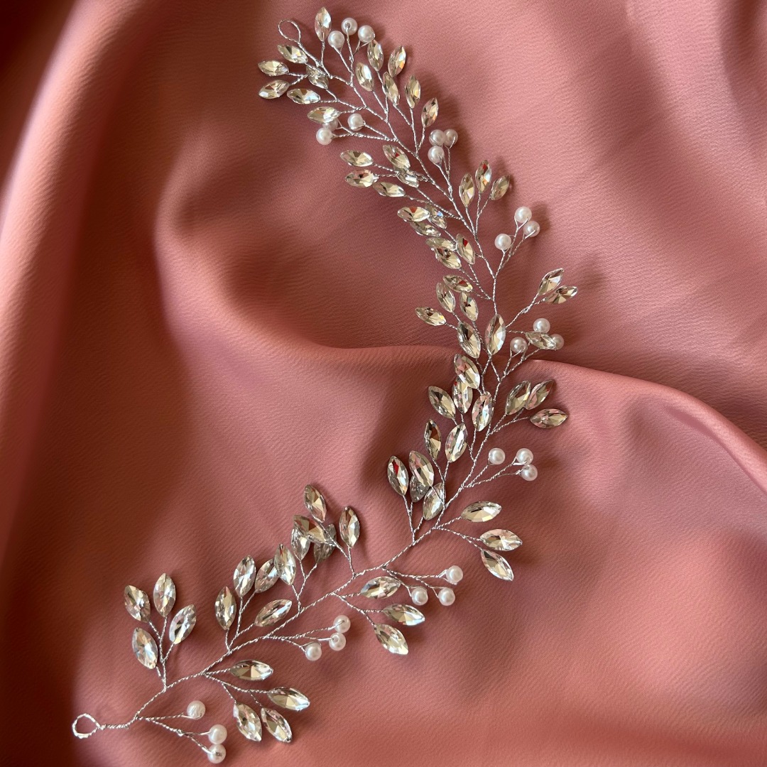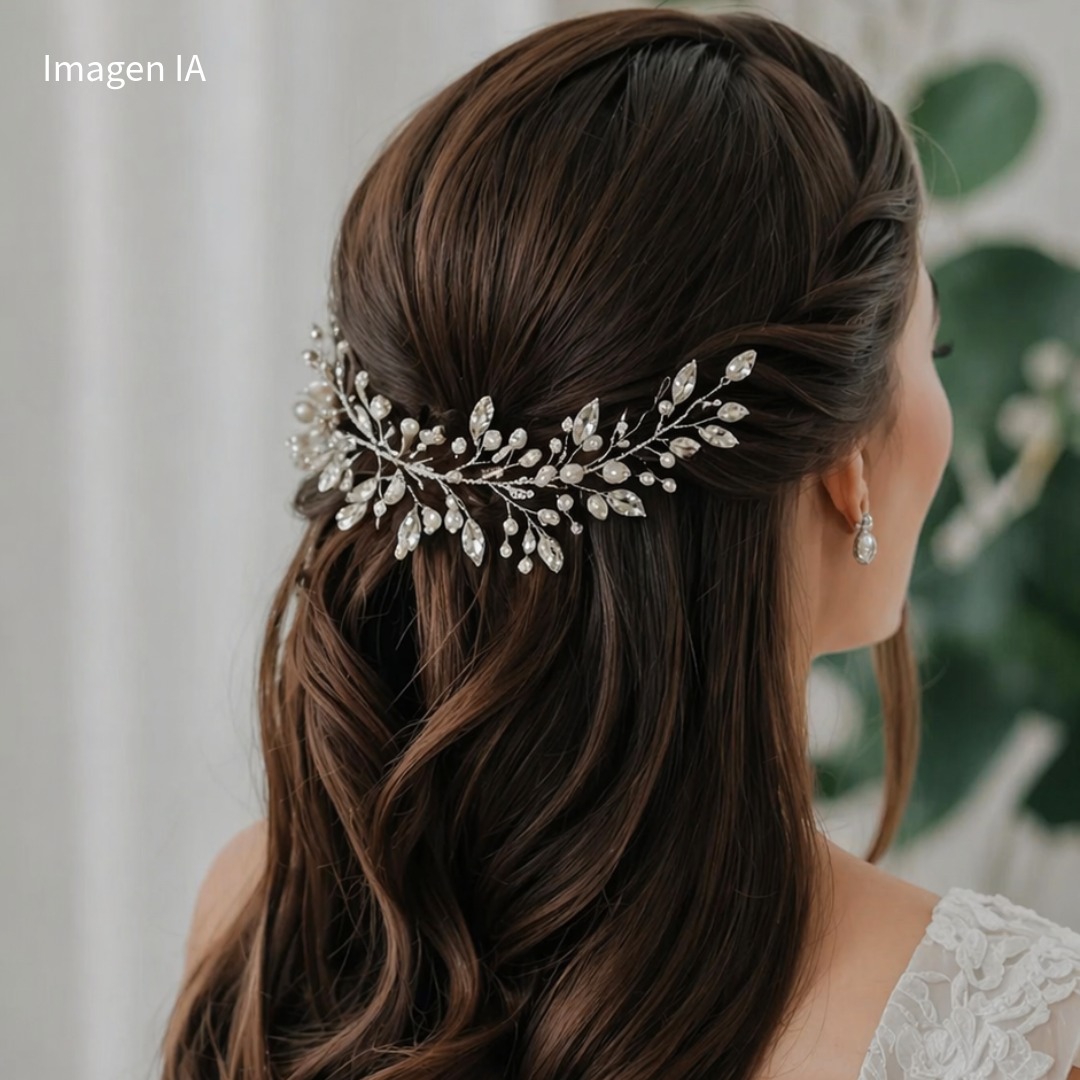 Tocado de novia con incrustaciones de strass y perlas, en alambre plata.