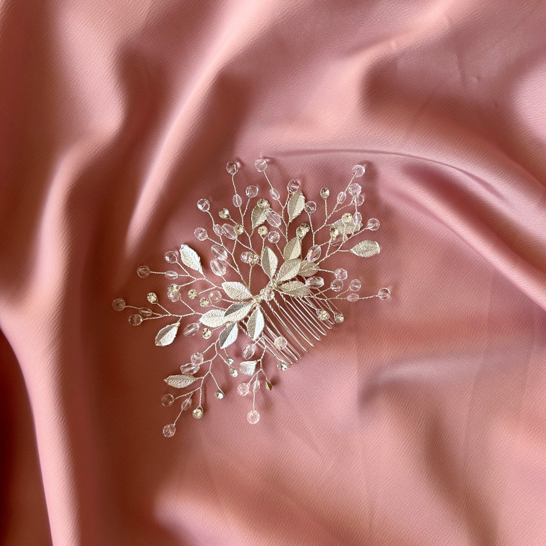 Peineta de novia con incrustaciones de strass y hojas plata, en alambre plata.