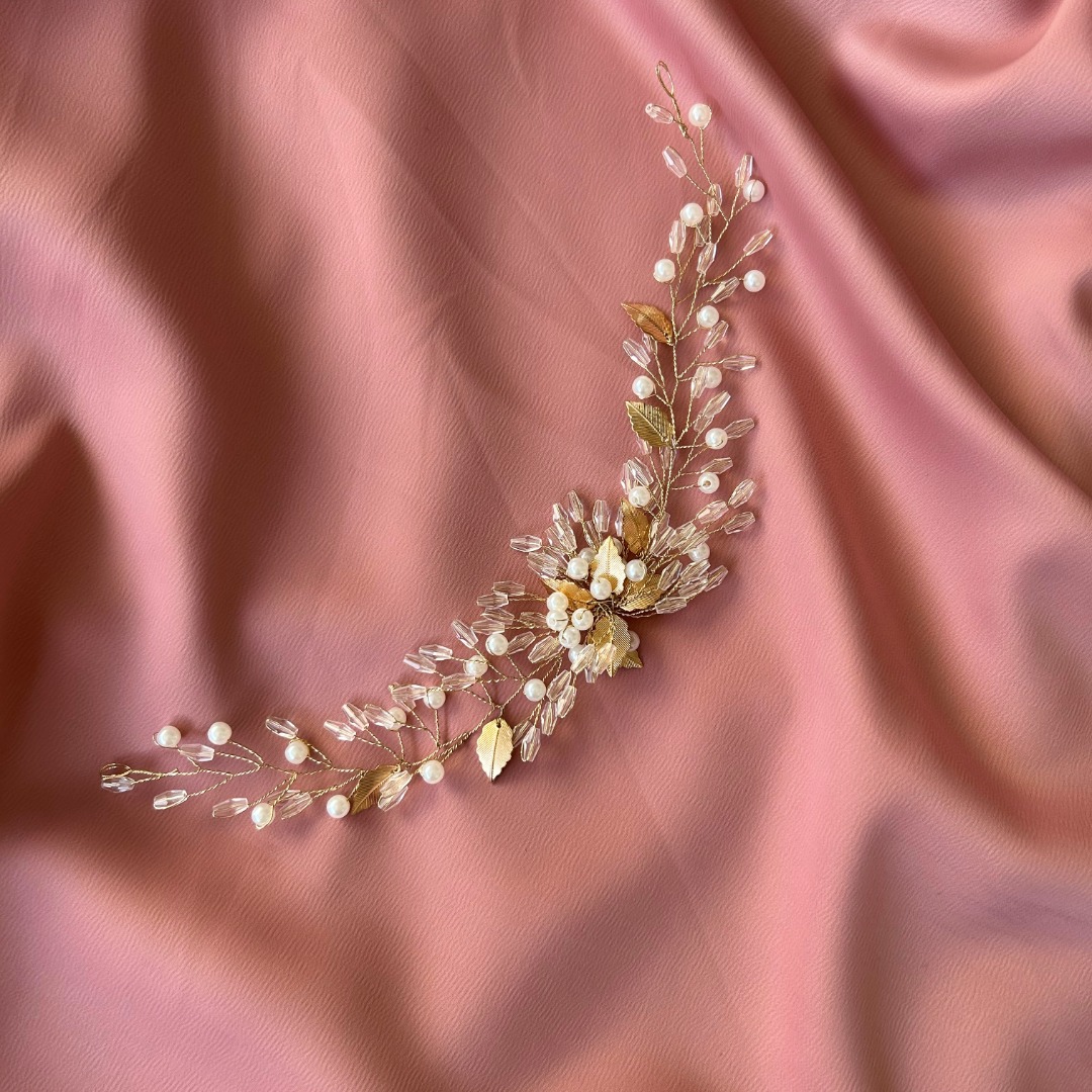 Tocado de novia con incrustaciones de strass, perlas y hojas dorado, en alambre dorado.