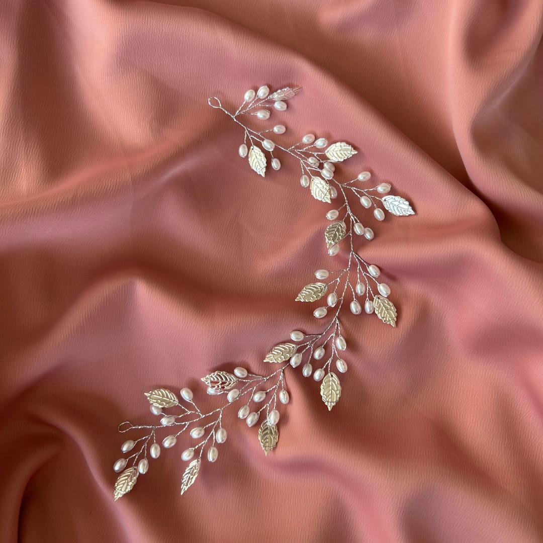 Peineta de novia con perlitas y hojas plata en alambre plata..