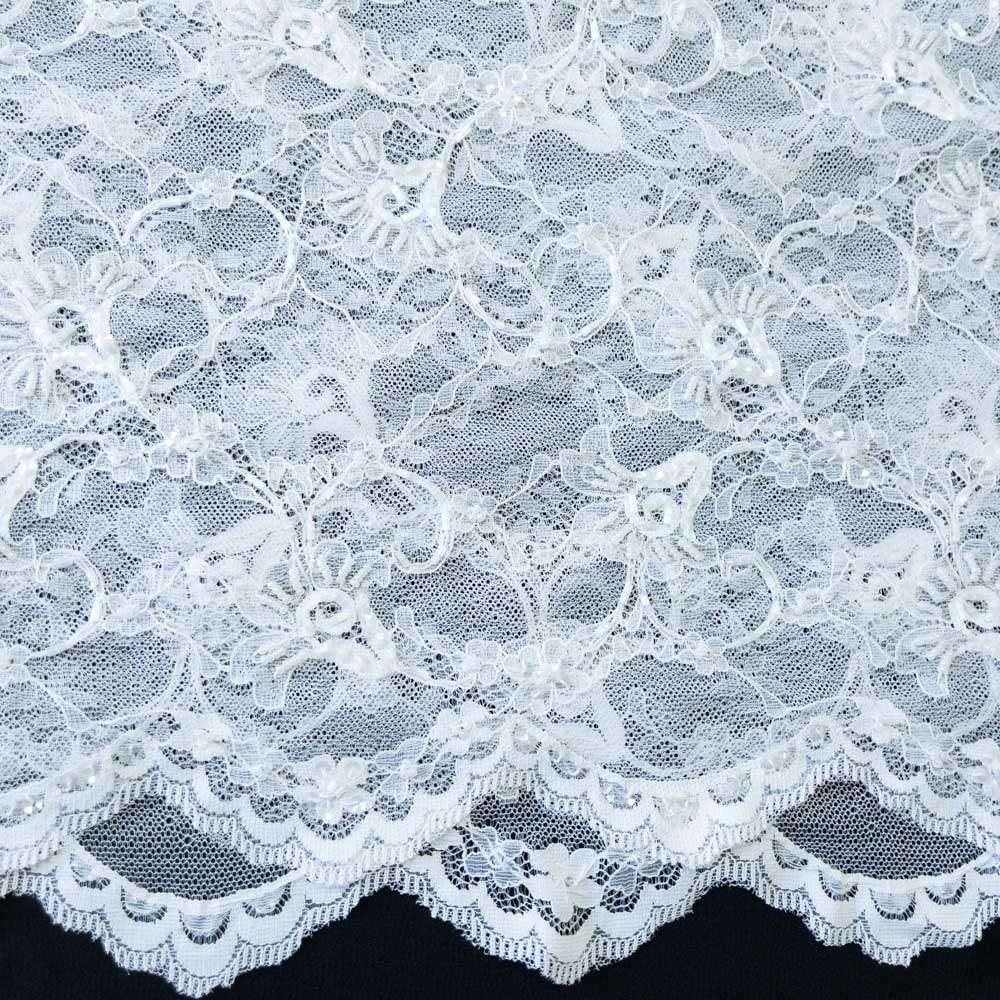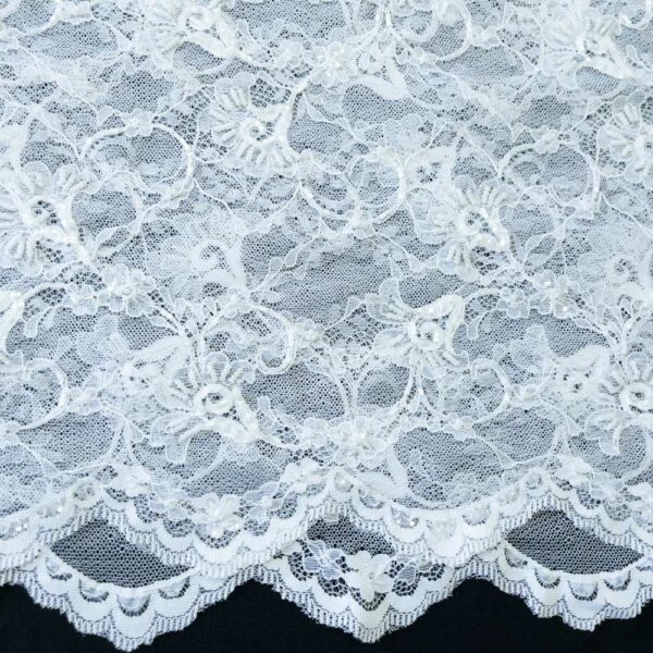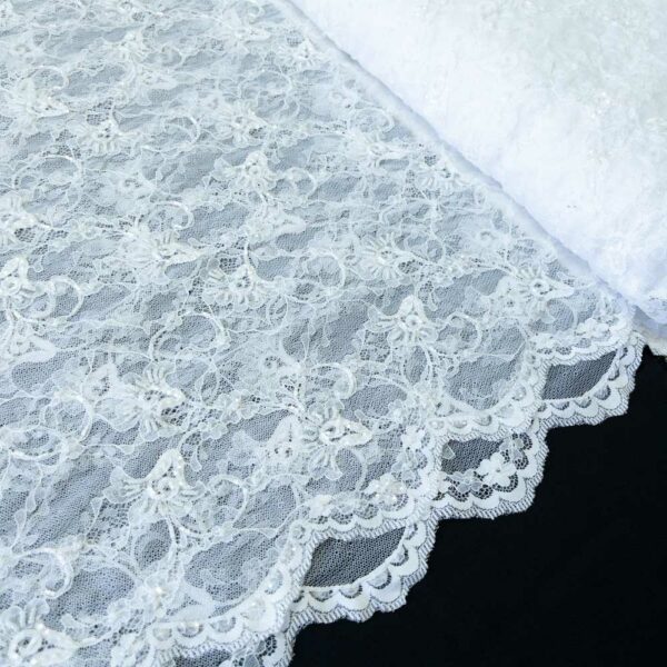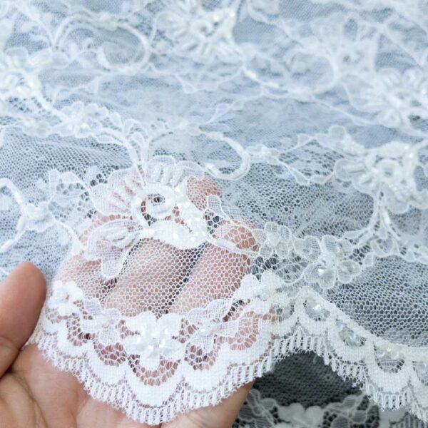 Encaje en tono blanco, tiene un delicado diseño con flores y pedrería. Tiene orilla en ambos lados.