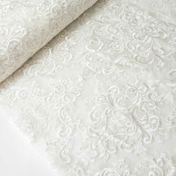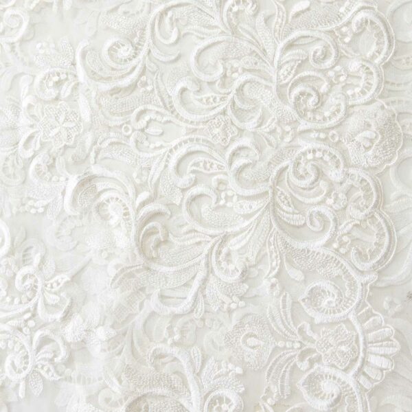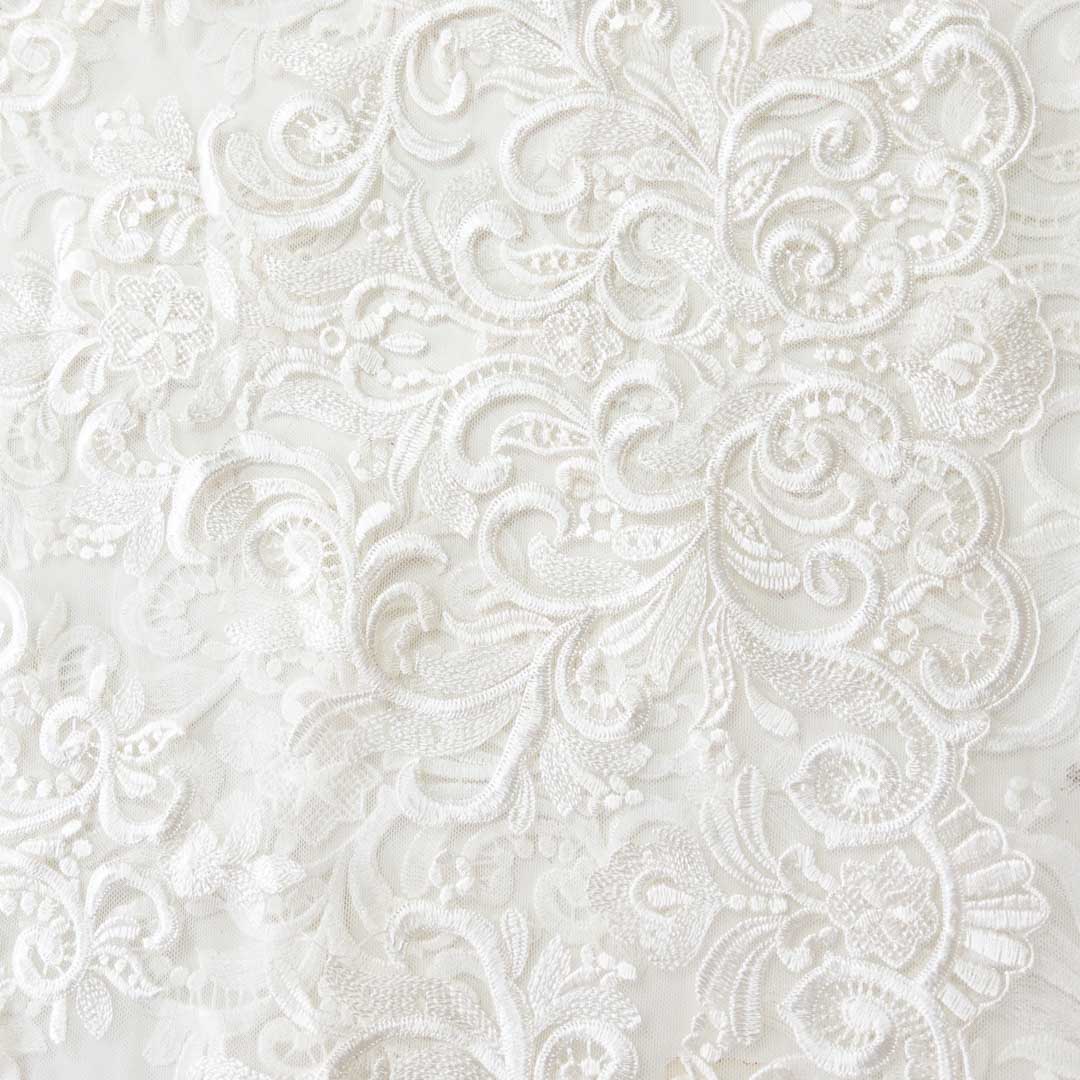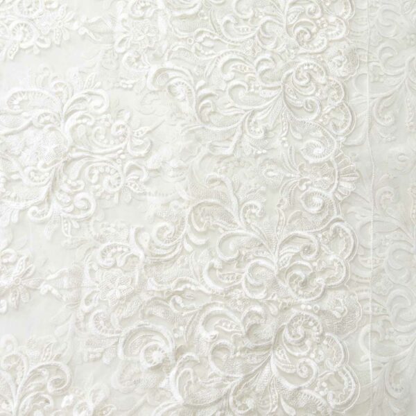 Tul bordado en tono marfil de tacto suave con diseño ornamental satinado a lo largo de la tela, tiene orilla en ambos lados.
