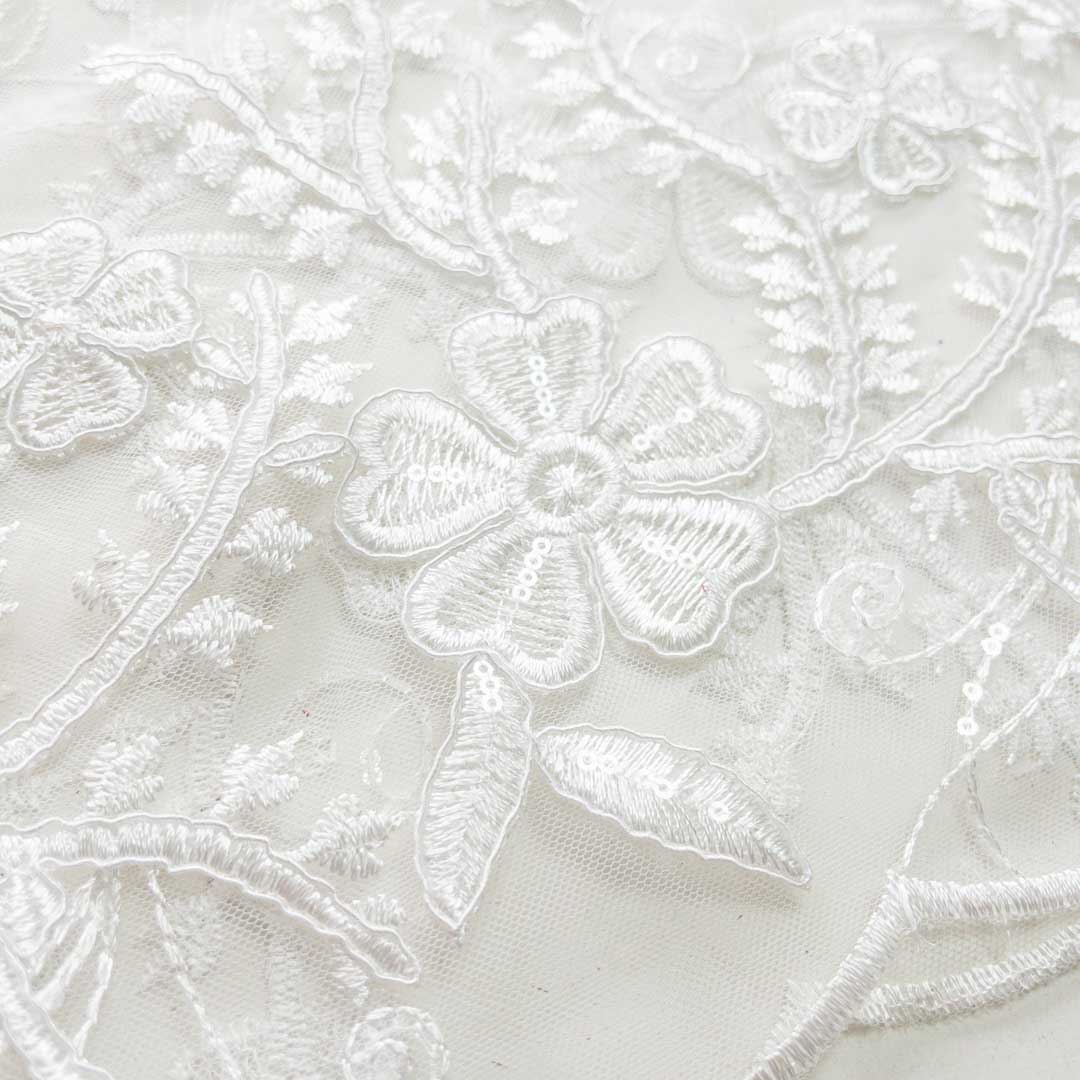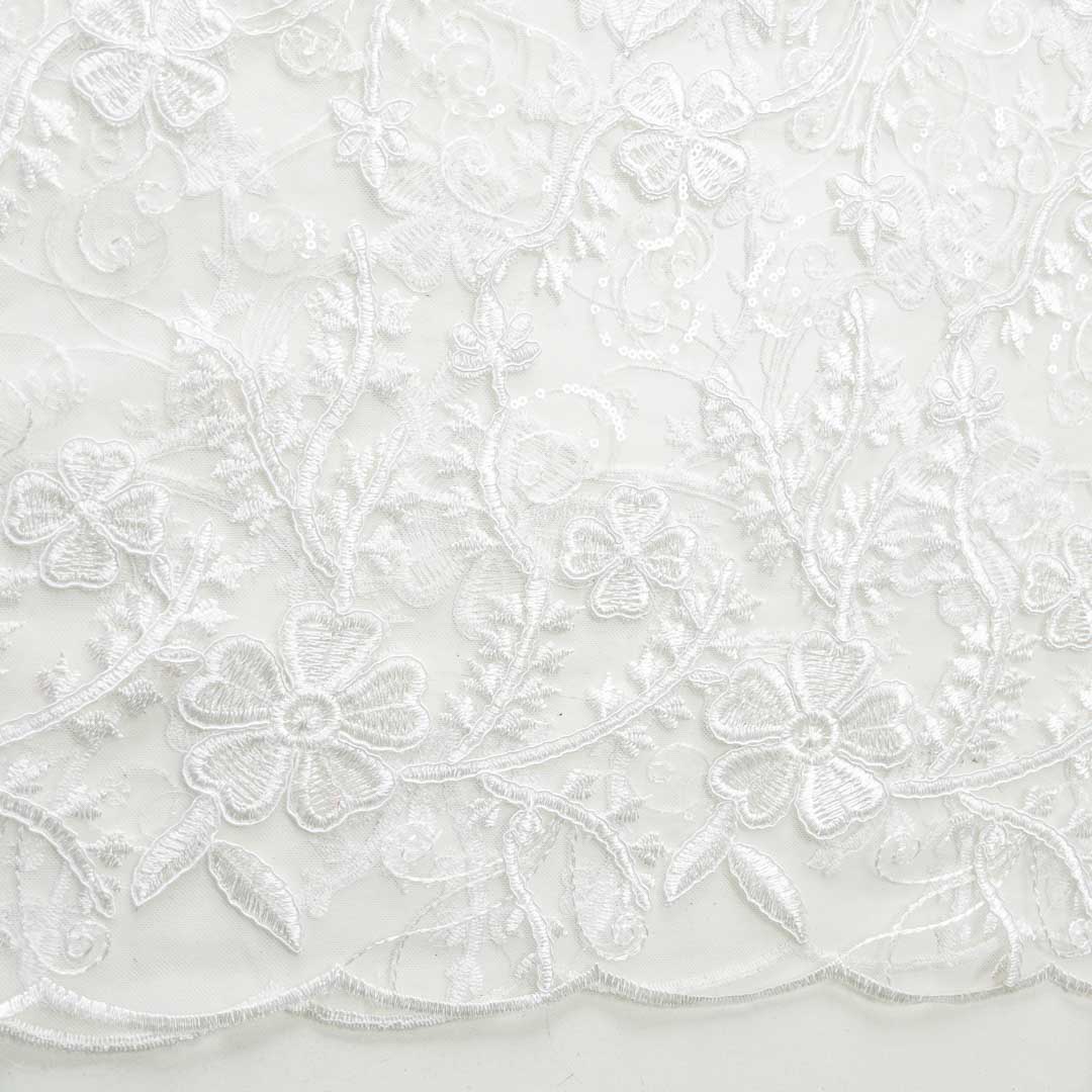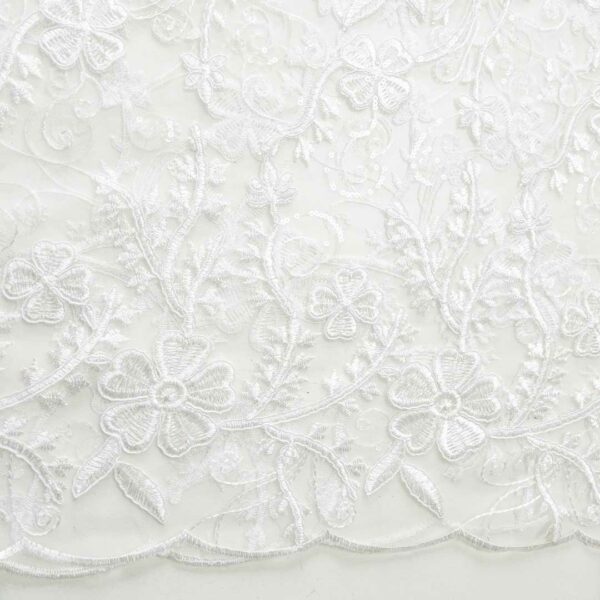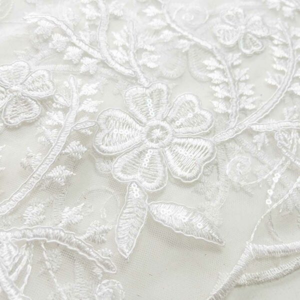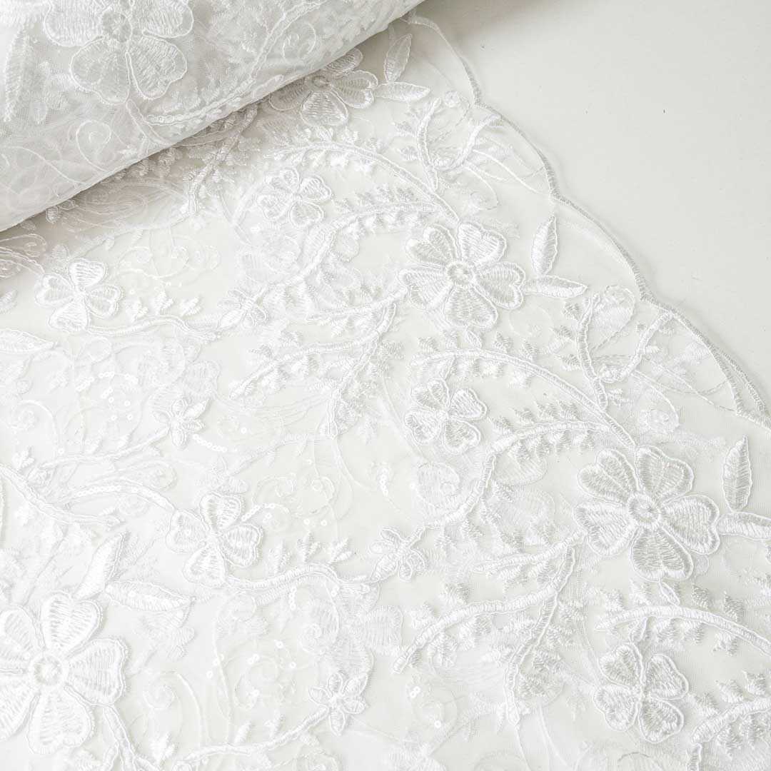 Tul bordado en tono marfil de tacto suave con diseño de flores a lo largo de la tela, tiene un brillo sutil gracias a sus lentejuelas transparente. Cuenta con orilla en ambos lados.