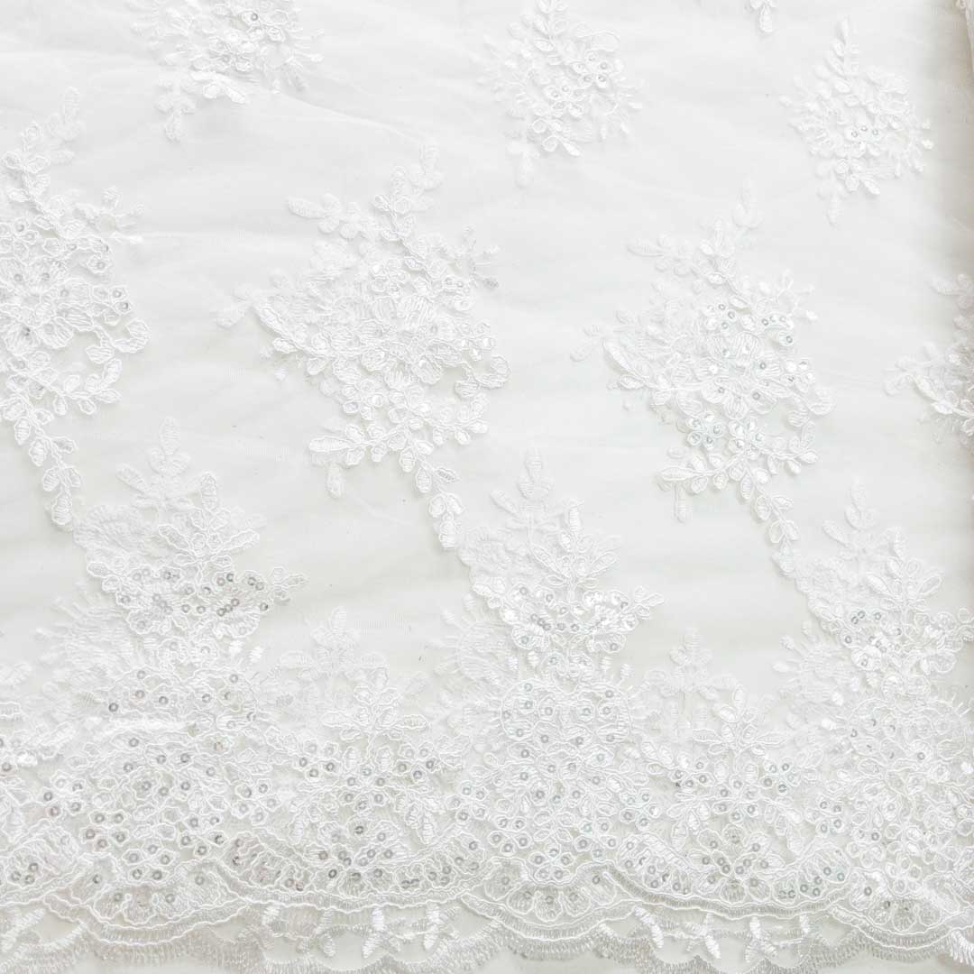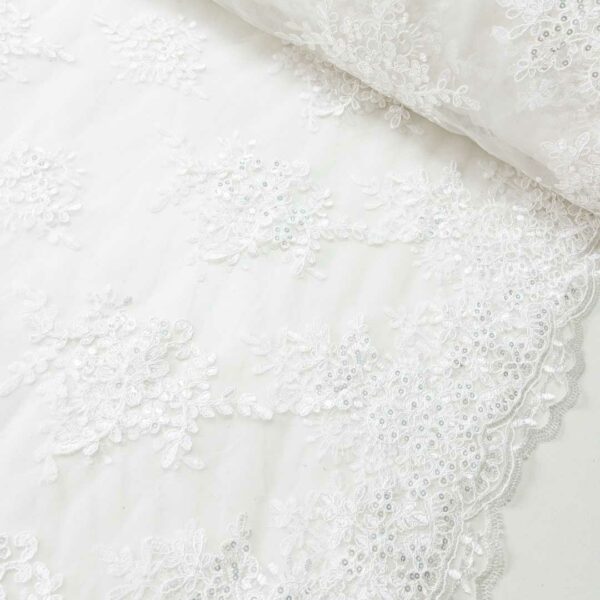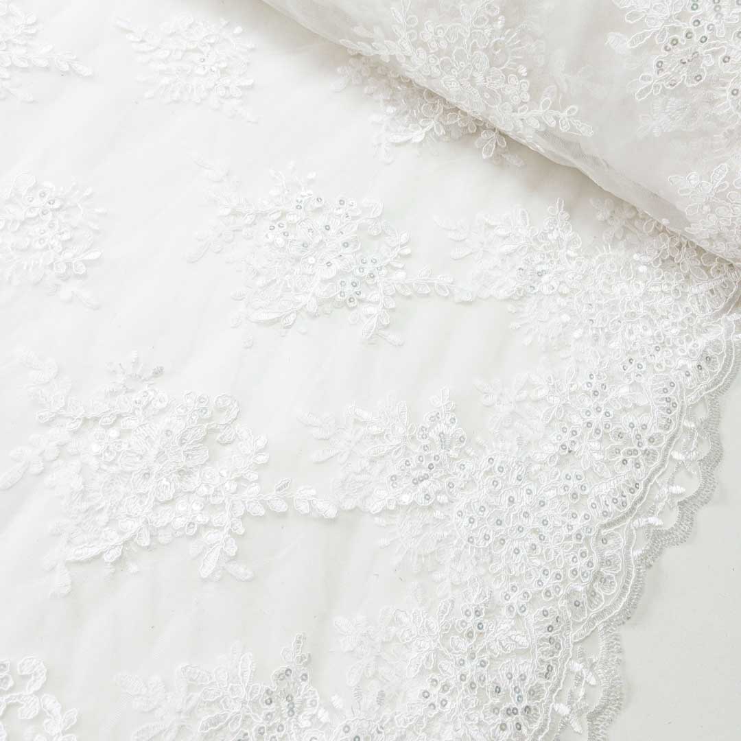 Tul bordado en tono marfil de tacto suave con diseño de flores a lo largo de la tela, tiene un brillo sutil gracias a sus lentejuelas en tono plata. Cuenta con orilla en ambos lados.