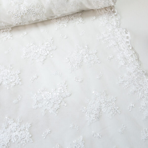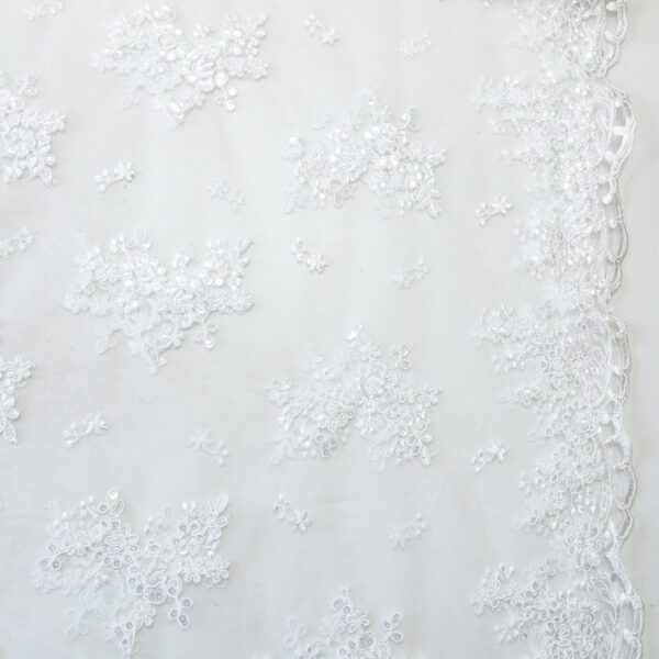 Tul bordado en tono marfil con diseño de flores a lo largo de la tela, tiene un brillo sutil gracias a sus lentejuelas transparente. Cuenta con orilla en ambos lados.