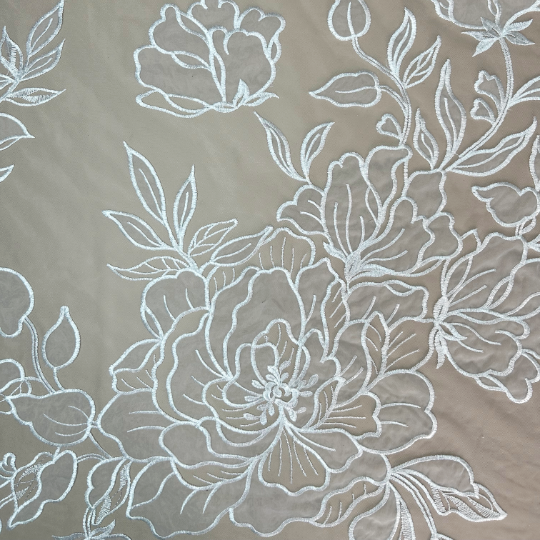 Tul bordado de lujo con un diseño floral grande, cada silueta bordada de la flor tiene un delicado satinado. No tiene orilla.