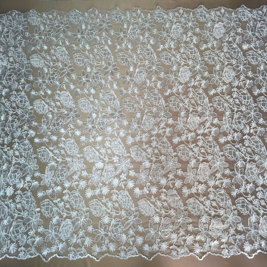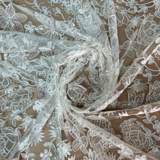 Tul bordado en tono marfil con diseño de flores a lo largo de la tela, tiene un brillo sutil gracias a sus lentejuelas plata. Cuenta con orilla en ambos lados.